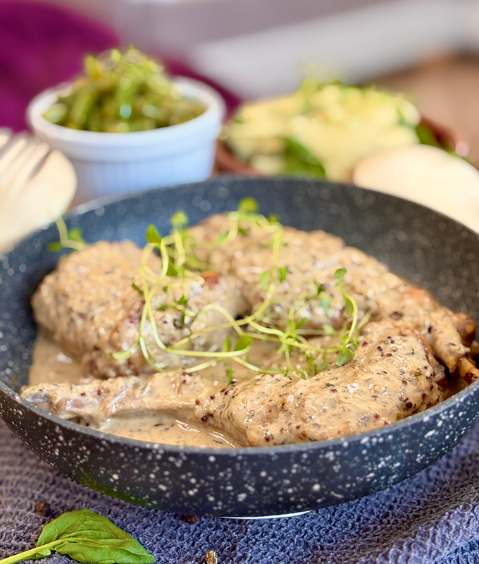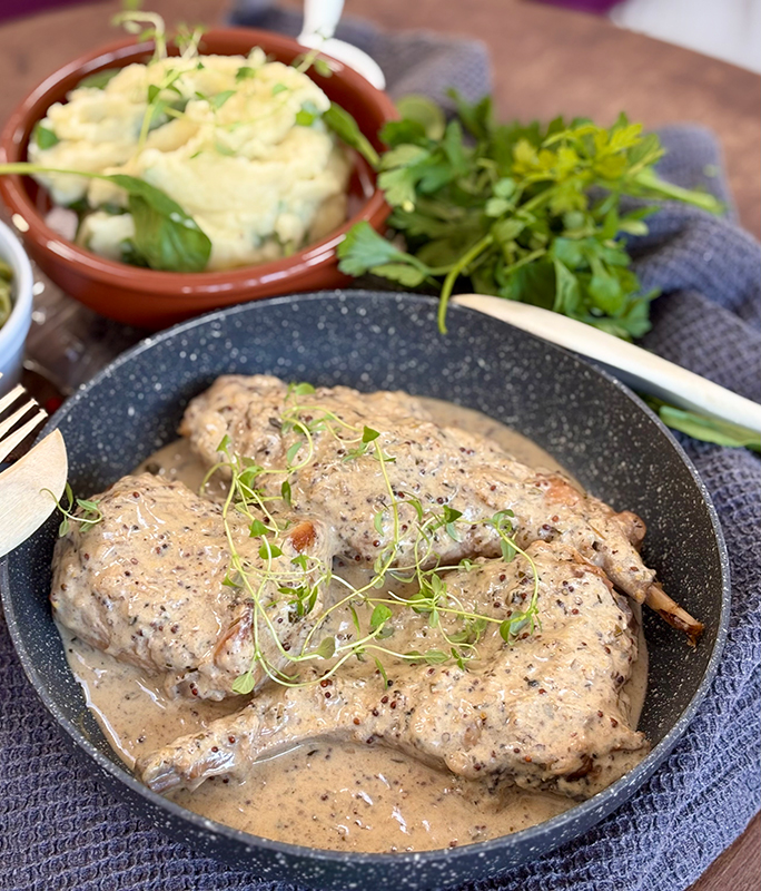 Dijoni mustáros nyúl, barnavajas spenótos krumplipürével, roppanós párolt zöldbabbal