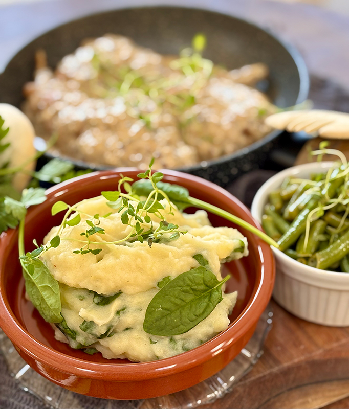 - Amikor megfőtt a burgonya leszűrjük, majd a barnavajjal együtt krumplinyomóval összetörjük. Sózzuk, borsozzuk, belekeverjük a szerecsendiót és a zúzott fokhagymát is. A tejjel együtt habosra keverjük.