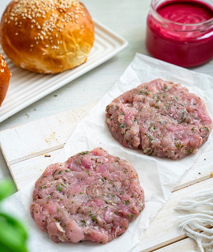 A klasszikus hamburger szósz helyett egy fetás céklás mártást készítettem mellé. A cékla földes, és a feta sós íze remekül kiegészíti a hús édeskés hangulatát.